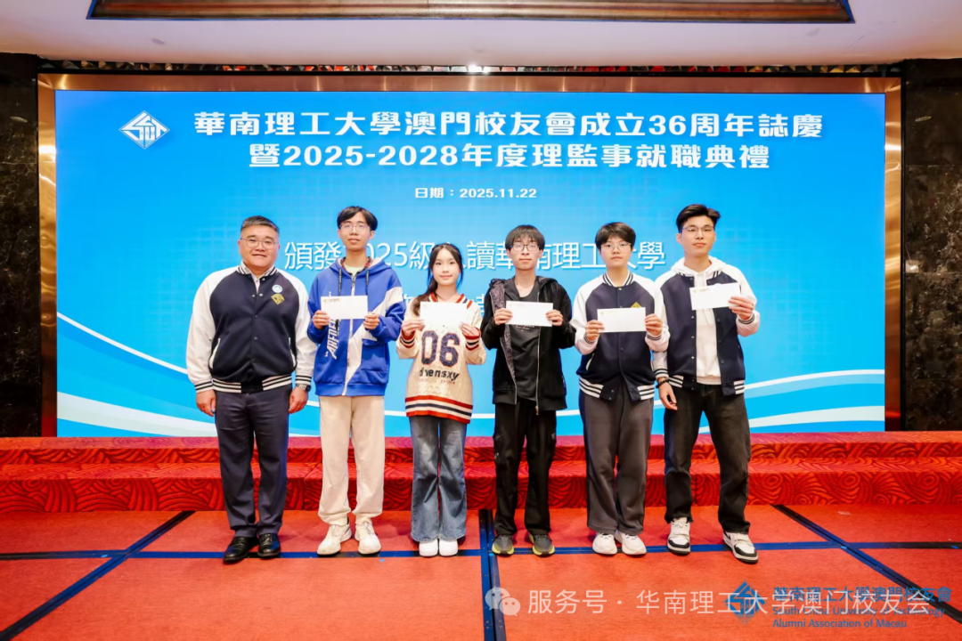 為鼓勵澳門學子深耕學業、報效家國,華工校友會江毅理事長為 2025 年入讀華南理工大學的澳門生準備了鼓勵金。他們是25級經濟學 陳鈺潔、25級旅遊管理 施青怡、25級電腦科學與工程 蘇榮桓、25級軟體工程 周灼霖、25級建築設計及其理論研究生 陳智煒。