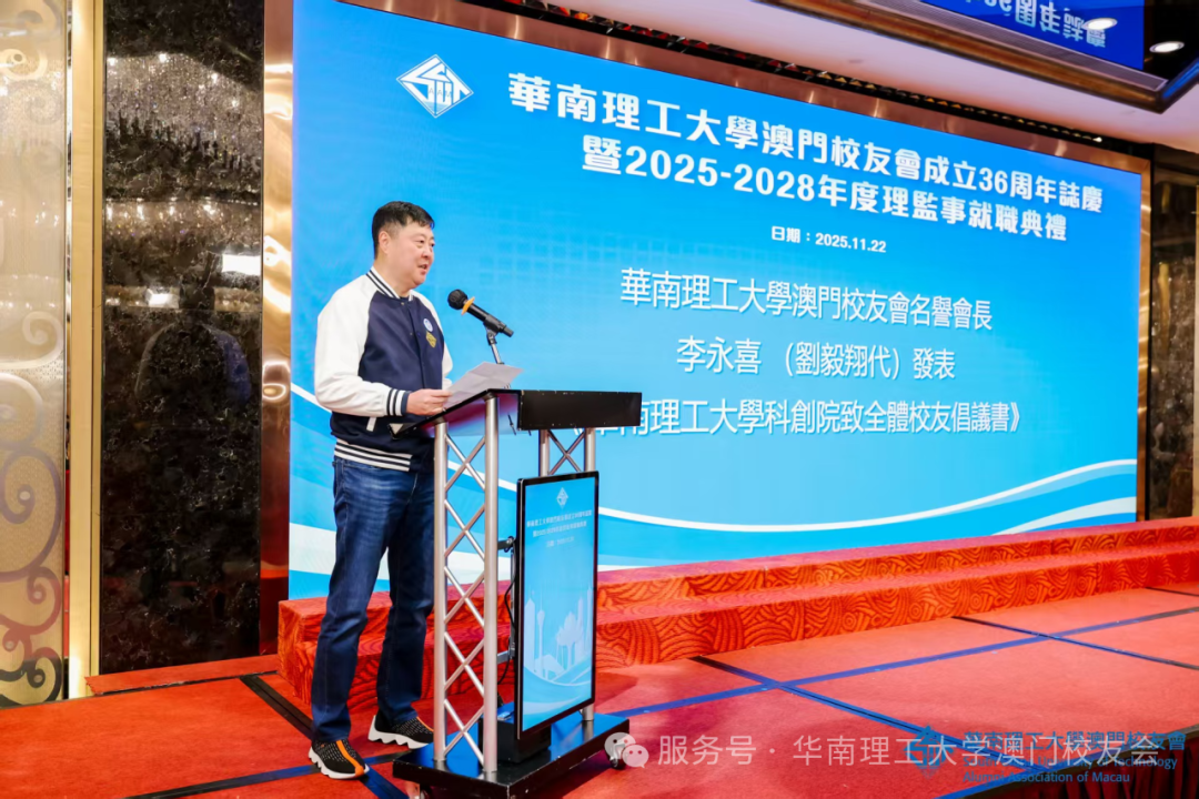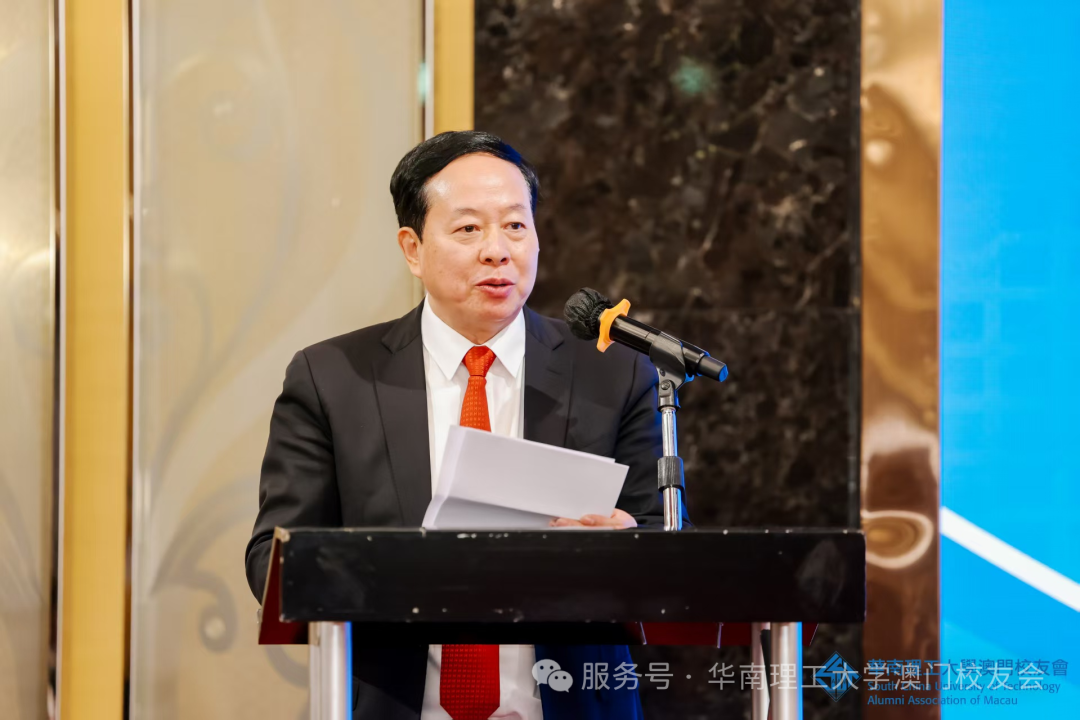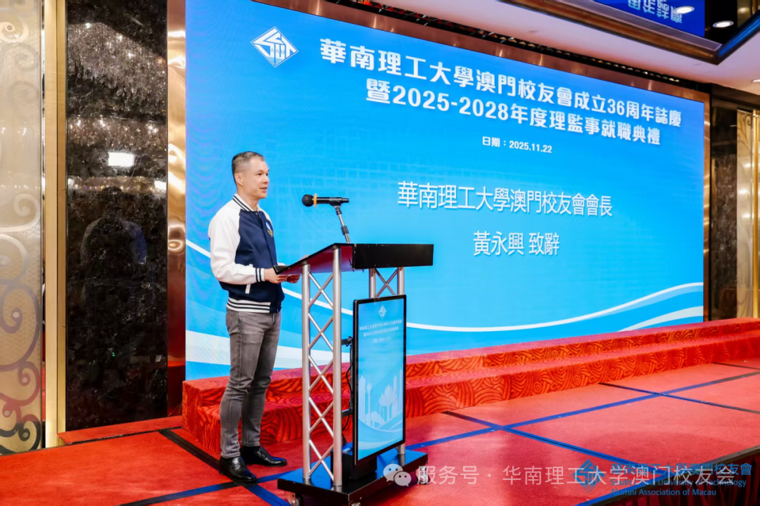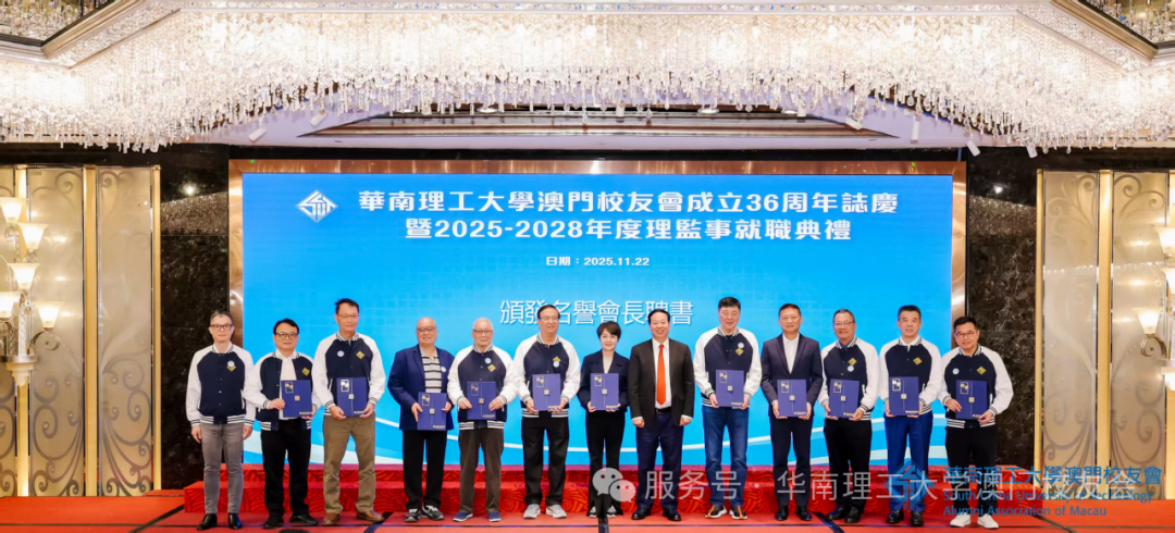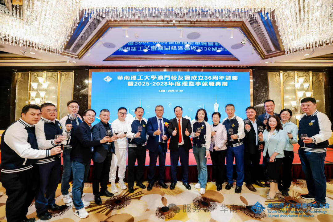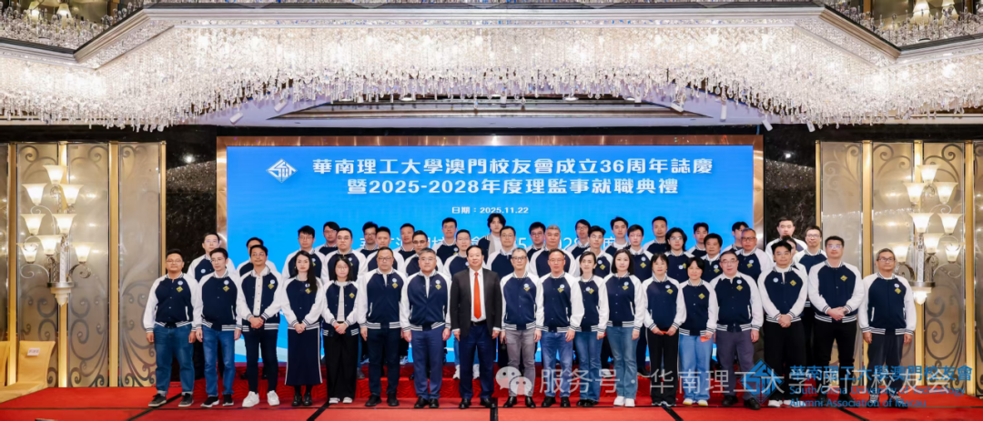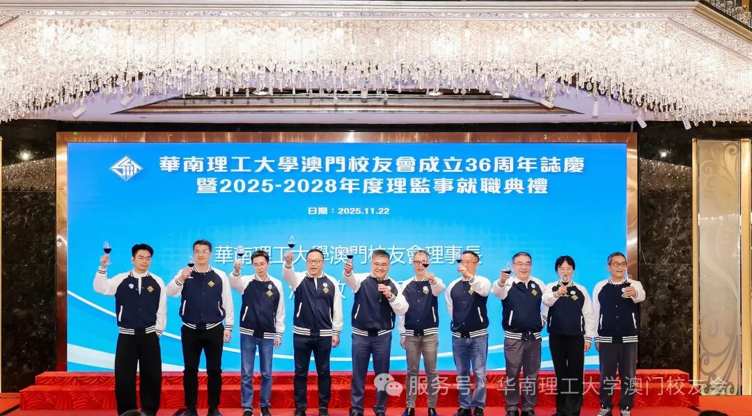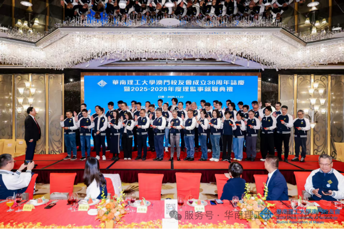2025 年 11 月 22 日晚,華南理工大學澳門校友會成立 36 周年暨 2025~2028 年度理監事就職典禮在澳門凱旋門酒店宴會廳舉行。華南理工大學黨委書記章熙春,副校長林藝文,全国政协委员、广东省工商联副主席、尚品宅配董事董事长李连柱,全国政协委员、广东省工商联兼职副主席、广州白云电器设备股份有限公司董事长胡德兆等眾多傑出校友,以及各地高校澳門校友會代表蒞臨祝賀,與澳門校友會成員共聚一堂,見證新一屆理監事履新。